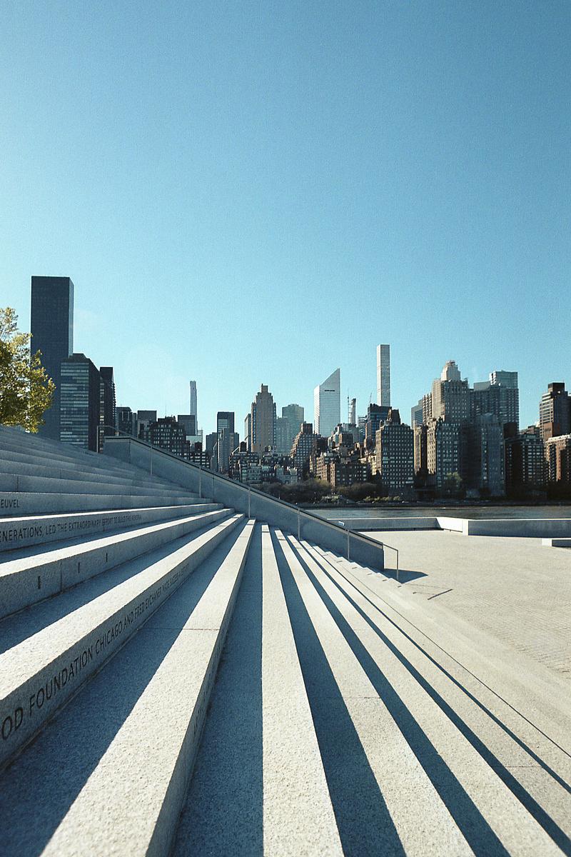 The Staircase at Four Freedoms Park on Roosevelt Island, overlooking the Manhattan Skyline. Taken on 35mm Kodak Portra 160 film in Summer 2019